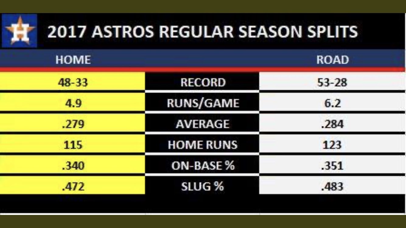 I know Altuve and Bregman hit better on the road in 2017. I have not checked the other guys. While attempted bank robbery is still a crime, I think the media would grow weary of this story a bit quicker if it was determined that the whole scheme was ultimately ineffective. Maybe someone at MLB already knows those stats but is not prepared to share them.