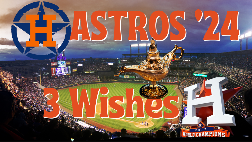 Today, this is a simple assignment. Pretend I am the first genie, and I appear to you in your man or lady cave. I am granting you three wishes only, but I do have some conditions on them. The wishes must be related to the Astros of 2024, but they can’t be team-related.